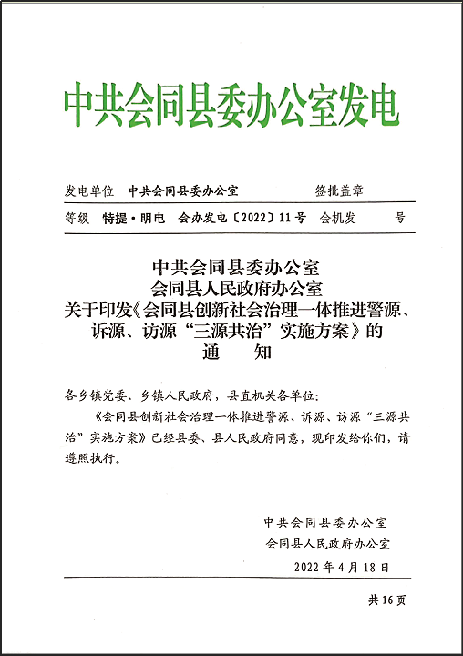 源头治理显成效。系统集成共治机制,建立健全“三源”共治闭环管理、分级调处、应急处置等“八项机制”和“警调诉调访调”对接联动体系,重构完善“三源”矛盾纠纷“排査摸底一研判例会一处置化解一督导问责”共治流程,把矛盾纠纷化解在源头和基层。警源治理:在基层派出所设立警务纠纷人民调解室,抓实“雪亮工程”效能发挥和“一村一辅警”前沿作用,整合110接警平台、122接警平台、移动警务平台,接到警情通过警源治理中心一键调度,实现信息、指挥、处置精准对接。诉源治理:围绕“一专五统”,将基层法庭打造成集咨询、立案、调解、法宣于一体的“家门口”式诉讼服务平台,探索出一条“小法院、大法庭”诉源治理新路子,2022年6月9日《人民法院报》作公开报道。访源治理:一手不初信初访办理质效控增量,一手抓重点信访积案化解减存量,制定出台《践行发展新时代枫桥经验“七条”措施》和《会同县化解信访积案四项接访机制和八项处理原则》,形成“7类、22项”访源治理措施体系。