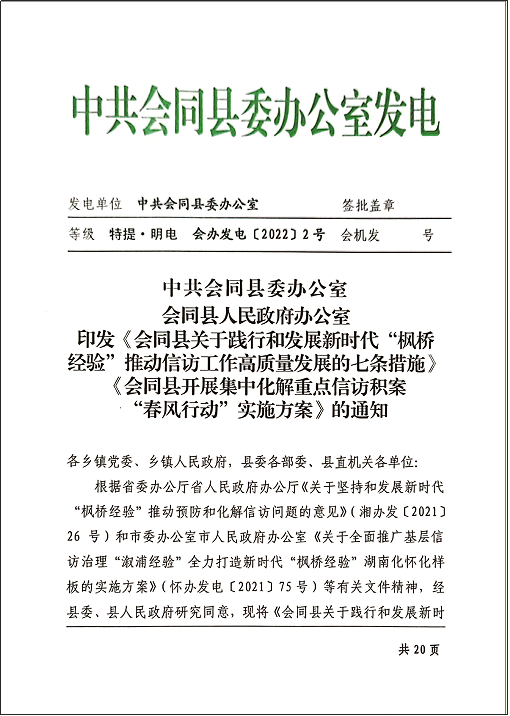 近年来,会同县坚决贯彻落实中央和省、市创新基层社会治理决策部署,聚焦源头治理,夯实基层基础,一体推进警源、诉源、访源“三源”共治,深化平安会同、法治会同建设,人民群众的安全感满意度持续增强,先后被评为省、市平安建设先进县,全国、全省信访工作“示范”县。