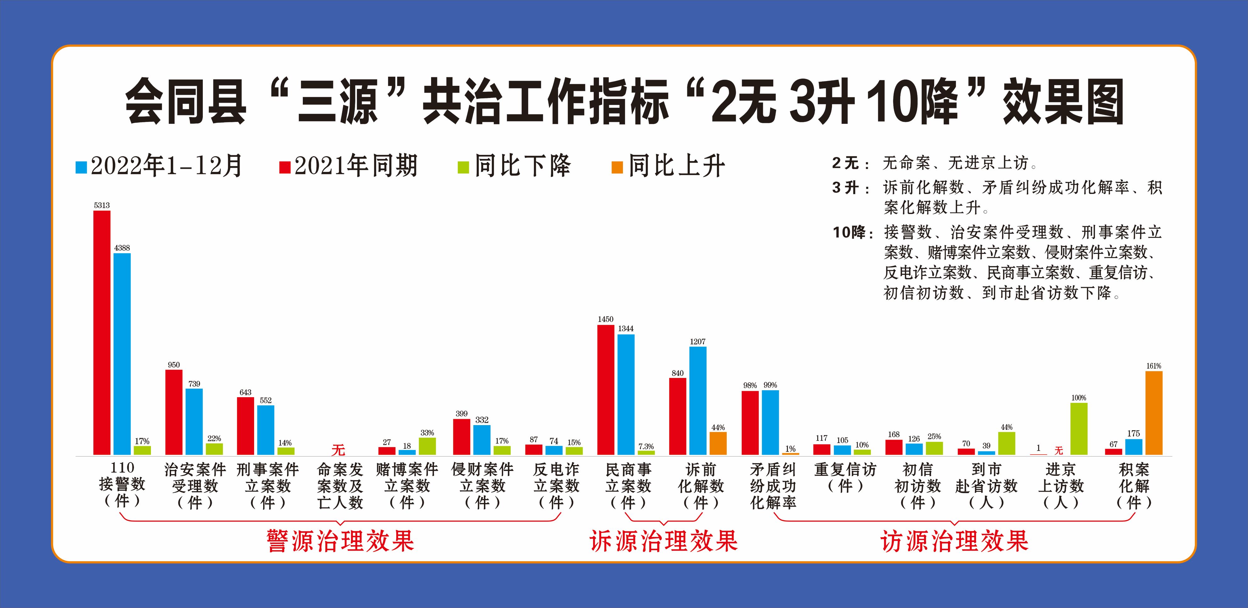 2022年1-12月,全县“三源”共治工作指标实现了“2无3升10降”(无命案、无进京上访“2无”,诉前化解数、矛盾纠纷成功化解率、积案化解数“3升”,接警数、治安案件受理数、刑事案件立案数、赌博案件立案数、侵财案件立案数、反电诈立案数、民商事立案数、重复信访、初信初访数、到市赴省访数“10降”)。